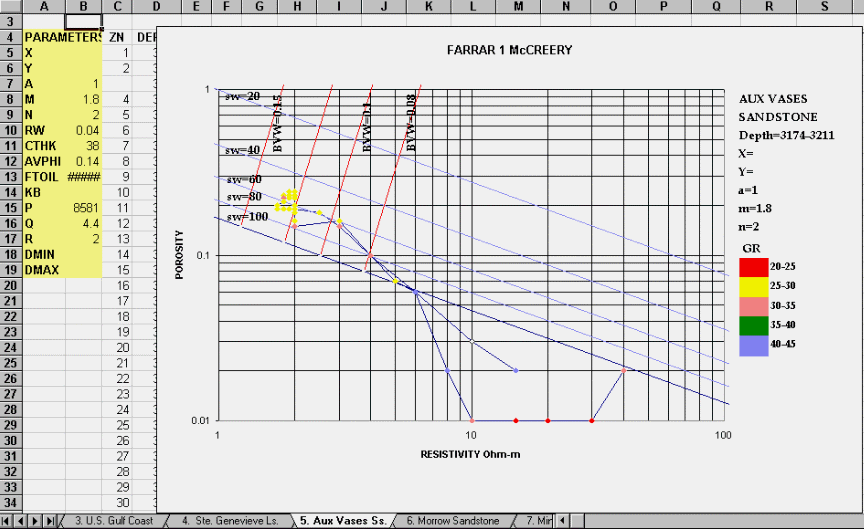 The PfEFFER analysis was used to generate Pickett cross plots annotated in color of depth and gamma ray. The data were entered manually onto the spreadsheet at 1-foot increments. The points form a cluster in a cleaner, mid-portion of the sandstone. The cross plots indicate that the reservoir has a high BVW of 14%, high porosity of 20 to 23% and Sw of 60%, respectively. The resistivity is 2 ohm-m or less. Even without the core information, a shaly or fine grained sandstone is suggested containing a portion of fine pores and a large fraction of bound water. However, the clustering of points is indicates nearly irreducible water saturation conditions in a hydrocarbon-bearing reservoir. The well was completed for 21 BOPD and 21 BWPD.