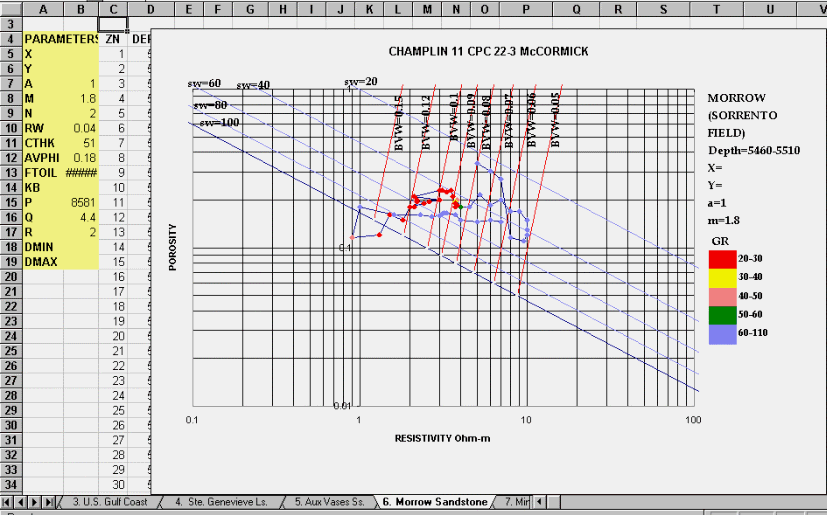 The Pickett cross plots constructed by PfEFFER reveal a trend of constant porosity with declining resistivity and increasing BVW and Sw with depth. This suggests that the reservoir is in a transition zone. The water saturation increases downward from about 33% to approximately 100%. BVW increases downward from 5 to 15%. The sandstone is shaly at the top with a Port Size (R35) of 0.2 to 0.5 micrometers. A cleaner sandstone is found at the base with an R35 of 10 to 50 micrometers. The main pay zone is more homogeneous with 20% porosity and an R35 of 10 to 15 micrometers. The horizontal trend of points with decreasing resistivity with depth is concluded to represent a transition zone. Overall, the reservoir increases in pore size with depth which is probably related to an increase in grain size. Unfortunately, the best reservoir quality rock lies below the oil:water contact. The well was perforated for 98 BOPD and 300 MCFGPD.