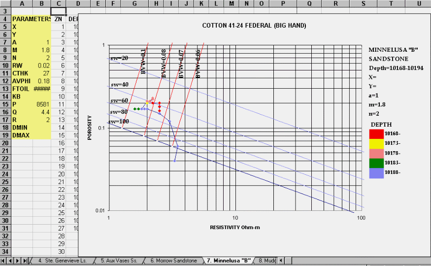 Big Hand Field was discovered in 1977. The low resistivity in the pay zone ranges from 1.8 to 2.5 ohm-m. PfEFFER analysis indicates a clustering of points in the pay zone with an Sw of 35 to 50% and BVW varying from 0.075 to 0.085. The porosity ranges from 16 to 22%. The gamma ray values are a consistent 20 API units. The clustering of points indicates that the reservoir is at or near irreducible bulk volume water which is borne out by the production and DST data. The well was perforated from 110168 to 10188 feet and recovered 862 BOPD, 85 MCFGPD, and 14 BWPD. The had DST recovered 3255 feet of gas cut oil.