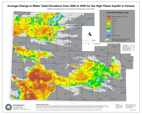 Average Change in Water Table Elevations from 2000 to 2005 for the High Plains Aquifer in Kansas Source: KGS Open File Report 2005-8 Page Size: 42 x 34 inches. Low Resolution : 96 Dots Per Inch (DPI), 4.36 MB JPEG High Resolution (PDF): 1.96 MB PDF |