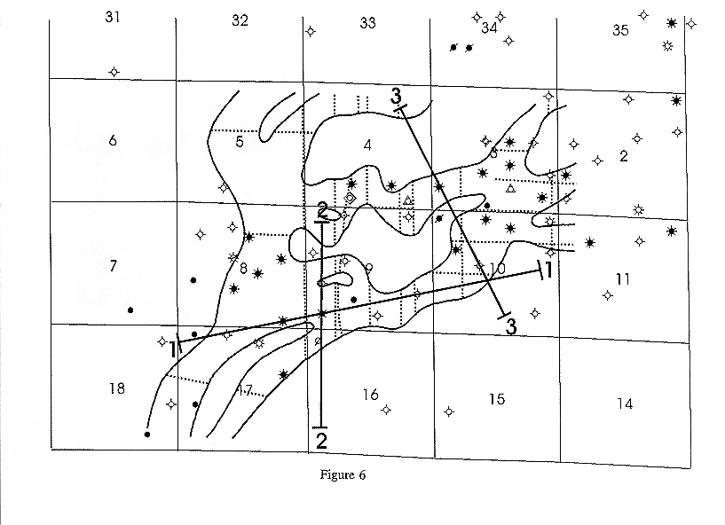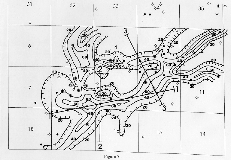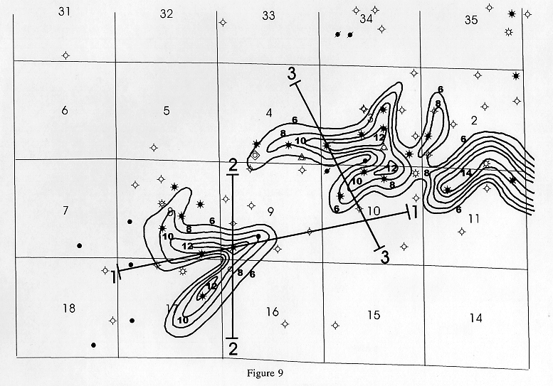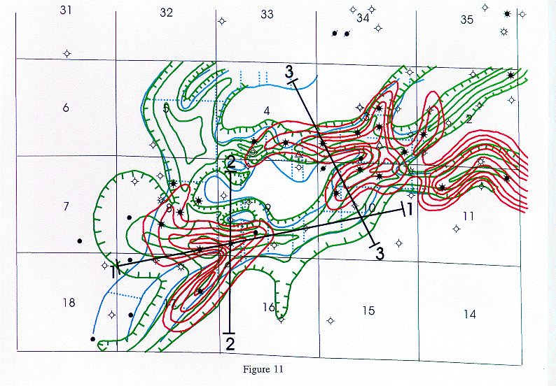 Figure 11. Combined maps of seismic channel anomaly(blue),Morrow to Mississippian isopach (green), and gross sand isopach (red) in Figures