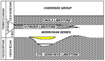 | Figure 2. Generalized stratigraphy of the Minneola area (modified from Clark, 1995). Production occurs from marine to fluvial-esturine sandstones surrounded by shales near the top of the Morrowan Series. Although shown as Morrowan, the actual age of these sandstones is debated and may actually be Atokan. Note that the thickest areas of sandstone appear to occur above channels cut into the underlying Mississippian limestone, though they are not limited to occurring above these channels. In addition, not all the channels have productive sandstones above them. |