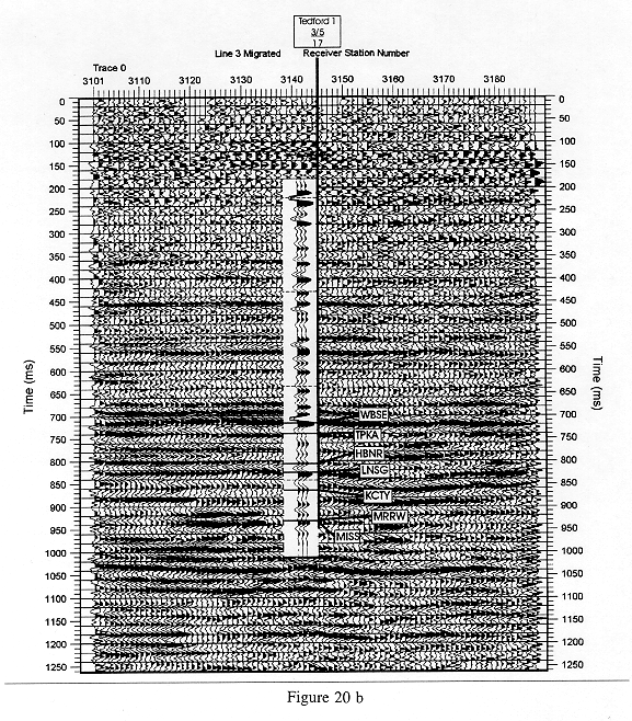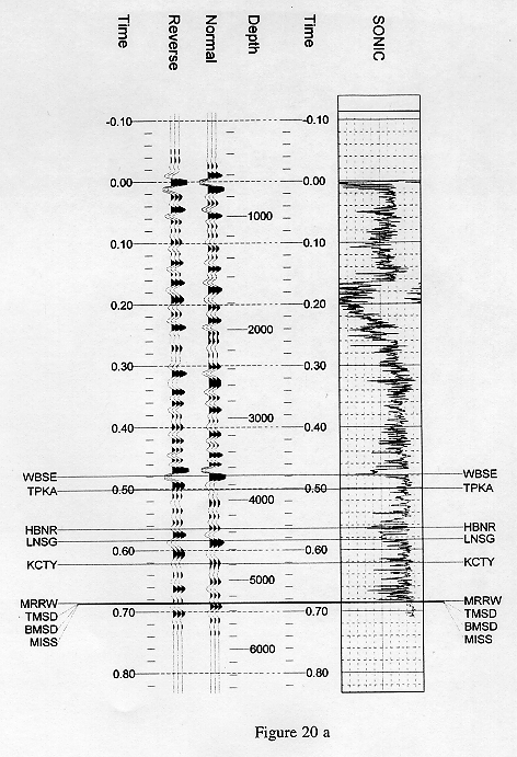 | Figure 20. a) Synthetic seismogram of the Tedford #1 well generated with a time varying zero phase Butterworth filter and both the sonic and density logs. The Butterworth filter has the following characteristics: 20 Hz, 36 dB/octave slope - 60 Hz, 72 dB/octave slope down to 520 ms; 20 Hz, 36 dB/octave slope - 50 Hz, 72 dB/octave slope from 520 ms to the bottom. Both negative and positive polarity synthetics are shown with the sonic log. Correlation tops include ) WBSE (Wabaunsee Group), TPKA (Topeka Limestone), HBNR (Heebner Shale), LNSG (Lansing Group), KCTY (Kansas City Group), MRRW (top of Morrow clastic interval) and MISS (top of Mississippian limestone). b) Correlation of normal polarity synthetic with Line 3 (migrated section with reverse of field polarity and every other trace displayed). Well location indicated by thick, black vertical line. |