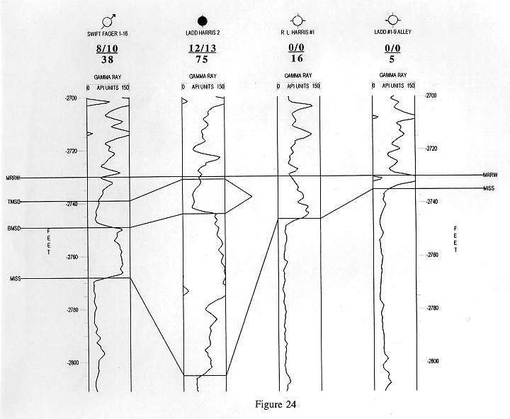 | Figure 24. Correlation of gamma ray logs along Line 2 to show varying total Morrow clastic interval thicknesses and the gross sandstone thickness near the top of the Morrow clastic section. See Figure 4 caption for legend of numbers between the well logs and well names and Figure 22 for correlation abbreviations. |