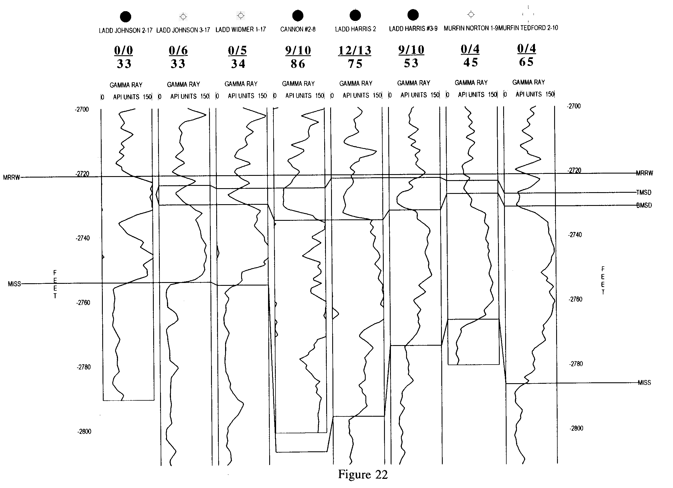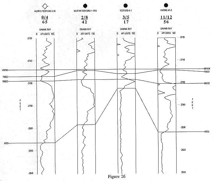 | Figure 26. Correlation of gamma ray logs along Line 3 to show varying total Morrow clastic interval thickness and the gross sandstone thickness near the top of the Morrow clastic section. See Figure 4 caption for legend of numbers between the well logs and well names and Figure 22 for correlation abbreviations. |