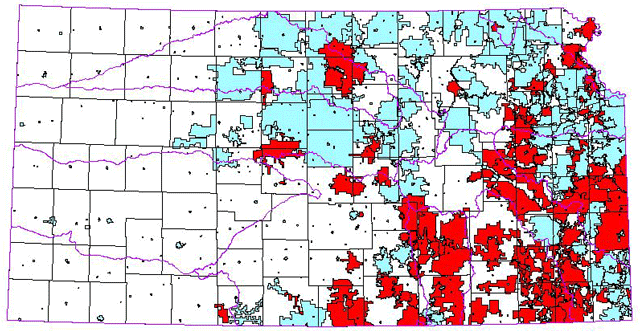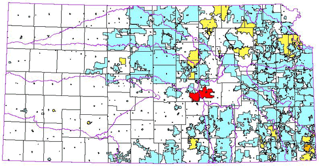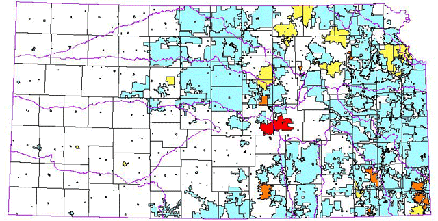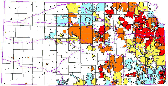SW Kansas Municipalities -- a special case study in isolation and resource access. Color coding by year of shortfall.