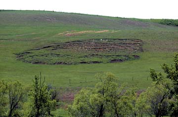 A landslide is the downhill movement of masses of soil and rock by gravity. Soil, as defined by civil engineers, is the loose material between the ground surface and the underlying bedrock. Landslides come in many forms. Rock falls occur along cliffs and outcrops where blocks of rock break off and fall down the slope. Block slides and slumps occur where blocks or masses of intact soil or rock move downslope along a failure surface. Block slides have straight failure surfaces, and the motion is analogous to a box (the landslide mass) sliding down a ramp (the failure surface). Slumps, on the other hand, have concave failure surfaces. As the landslide mass moves along this curved surface, it rotates and tilts trees and other objects so that they point uphill. Earth flows (fig. 2) are landslides in soil in which the landslide mass breaks apart instead of remaining relatively intact as in a slump or block slide. The motion in an earth flow is analogous to a thick mixture of soil and water oozing down the slope. Creep is the slow, imperceptible downslope movement of soil and rock. Because creep rarely fractures the ground surface, other evidence such as tilted trees, telephone poles, or walls must be used to identify affected areas. Creep is widespread on hillsides throughout Kansas.
