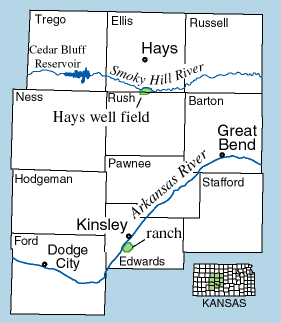 Hays, Kansas, a city of about 18,000 people, is about 22 miles (35 km) downstream from Cedar Bluff Reservoir and about 10 miles (16 km) north of the Smoky Hill River. One of the city's primary water sources is a well field in the alluvial aquifer of the Smoky Hill River, which produced about 2,500 acre-feet of water annually. Lessened streamflows in the Smoky Hill--caused by the lower water tables, decreased runoff, and the lack of discharge from the reservoir--meant that considerably less water was available in the Smoky Hill to recharge the alluvial aquifer. Yields in the Hays well field dropped to about 1,000 acre-feet annually. Because of dwindling water supplies, Hays began a number of conservation efforts, resulting in a substantial reduction in per capita water use. The city also began aggressively seeking additional water sources, and eventually purchased land and water rights to a ranch in Edwards County, Kansas, about 85 miles (136 km) away, with plans of transferring water for municipal use in Hays, in spite of considerable opposition to the plan in Edwards County.